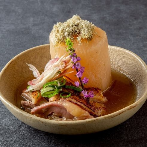 This is an exquisite dish that allows you to enjoy the rich flavor of Nagoya Cochin, one of Japan's three great local chickens.The fragrantly grilled chicken fat and the daikon radish infused with our proud flying fish stock create a gentle flavor that melts in your mouth.The rich flavor of the local chicken spreads the more you chew it, and the refreshing aftertaste of the broth will fill your soul.Enjoy this luxurious winter dish, where the individuality of the ingredients come together.